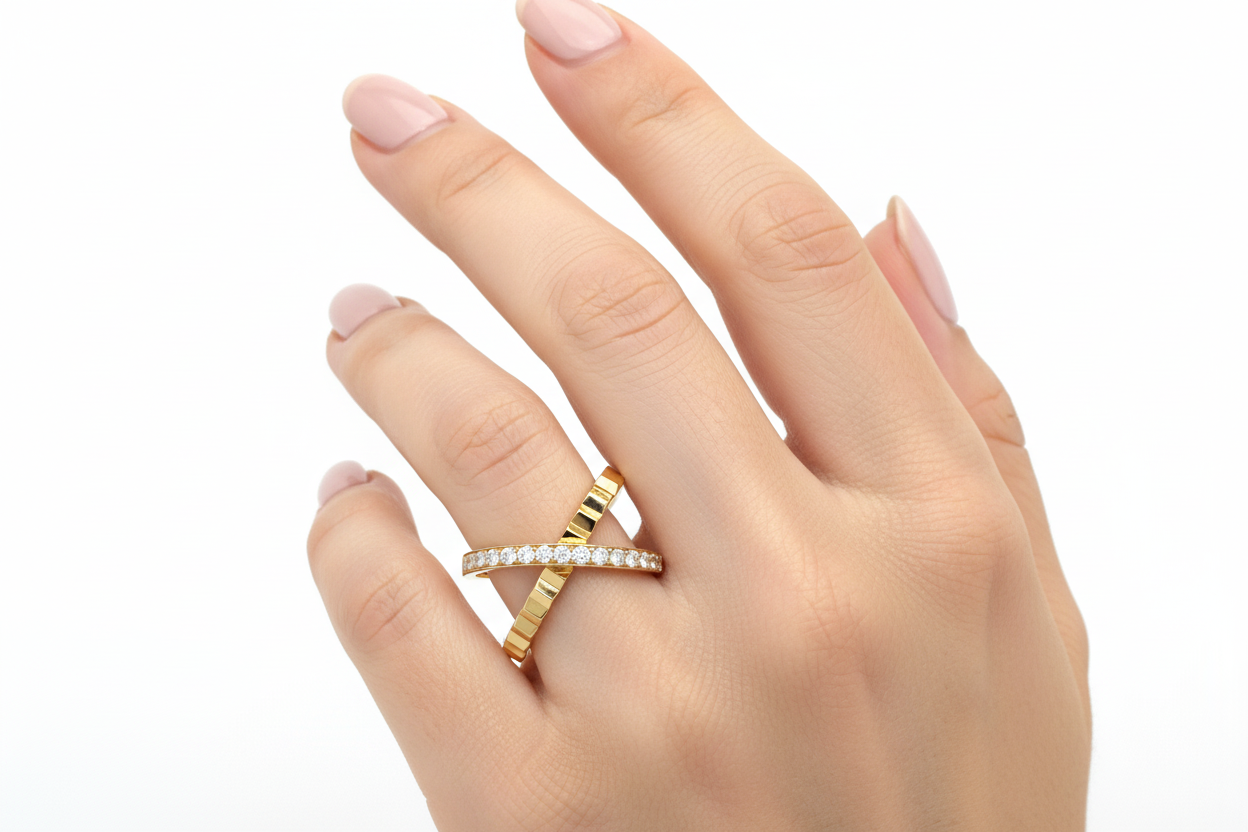 18k yellow gold crossover Ring set with natural round brilliant diamonds