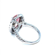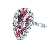 Our custom made diamond halo ring is featuring a 4.07 ct pear shaped pink morganite gemstone and natural round brilliant diamonds set detail