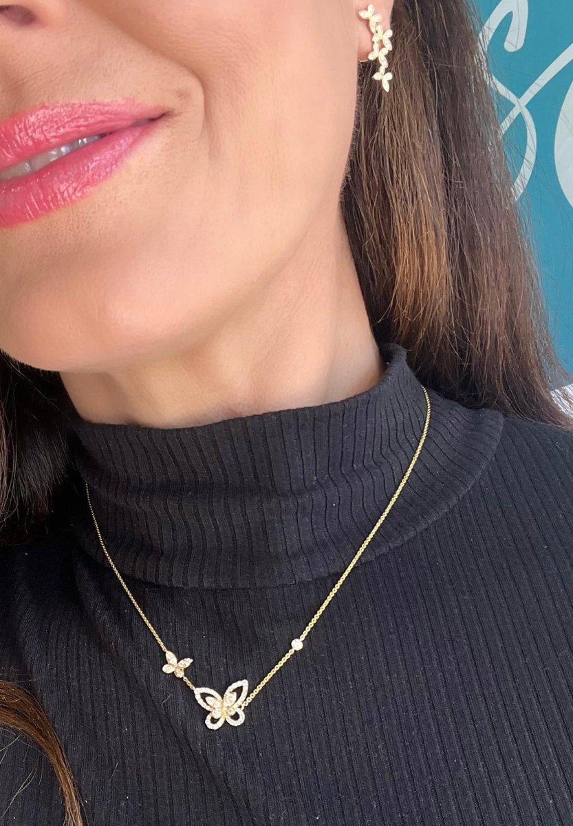 The necklace is set with a smaller diamond pave butterfly and a larger one, adding a touch of sparkle to your outfit.