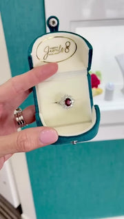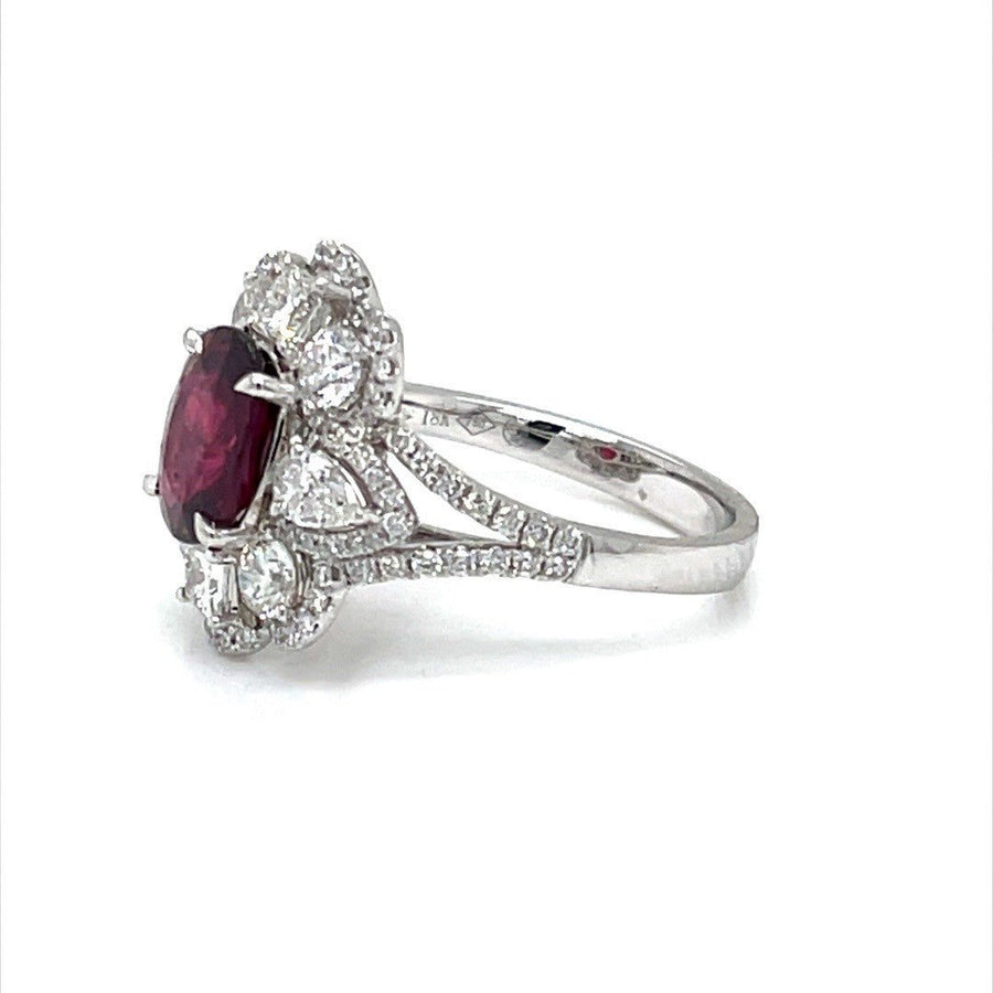 At the core of this sparkling floral diamond halo is a radiant red oval ruby, held in a prong setting.