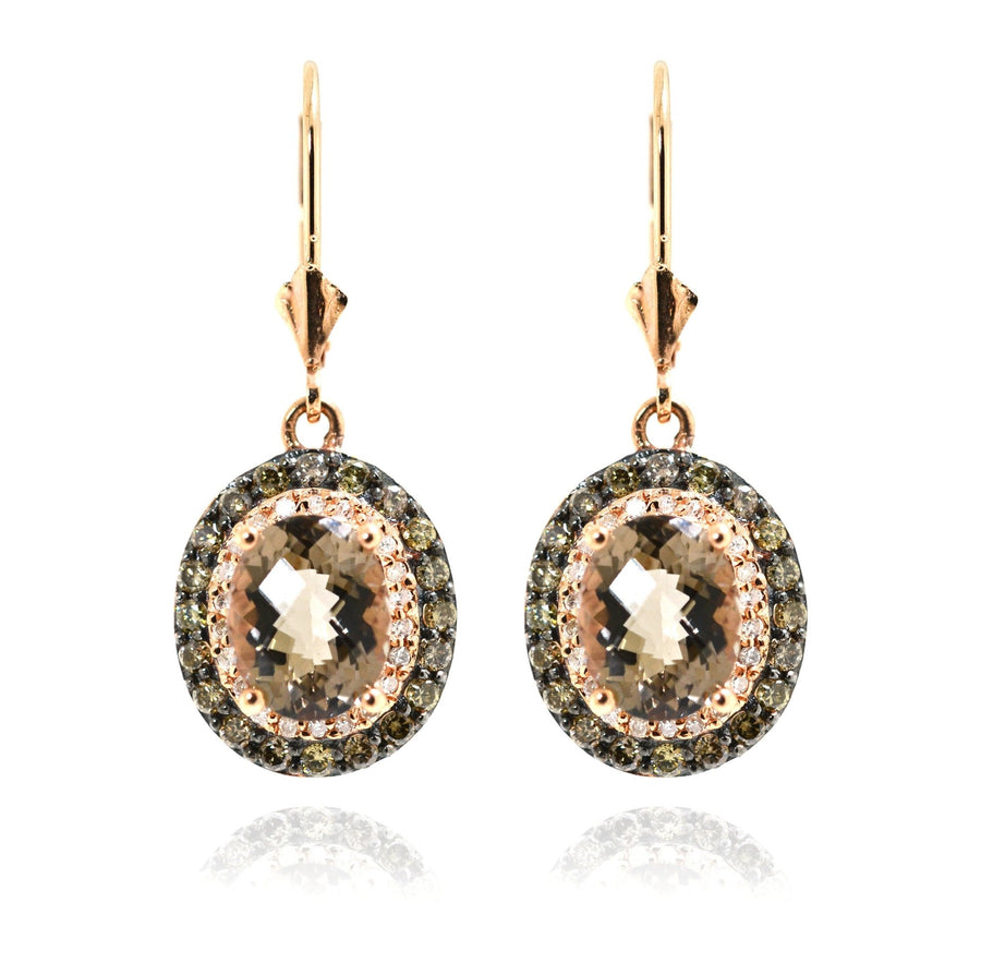 18ct Rose gold double diamond halo smokey quartz drop earrings set with a row of round brilliant white diamonds and set on the outer halo with cognac diamonds