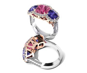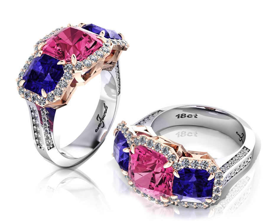 This 18ct White and rose gold dress ring features an asscher cut 2.68ct tanzanite and two pink tourmalines asscher cut totalling 3.65ct, surrounded by a halo of diamonds totalling 0.90ct.