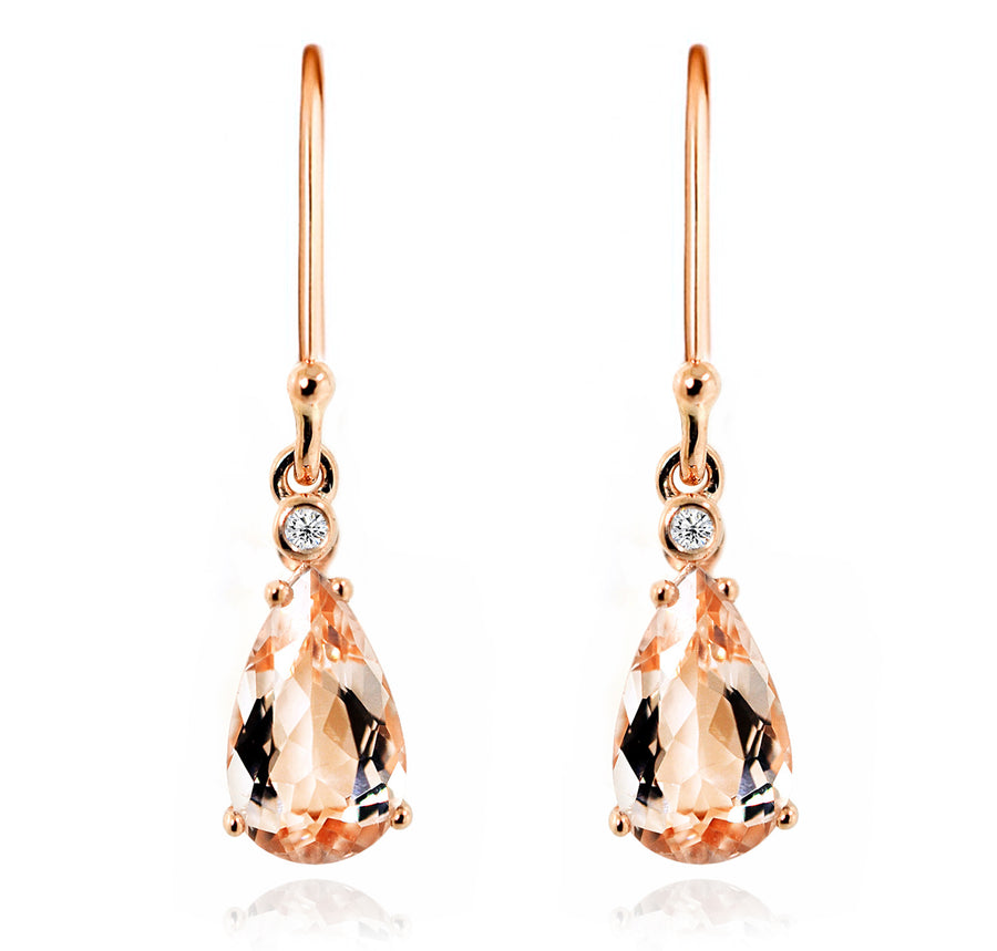 9ct Rose gold pear cut morganite drop earrings with a sheppard hook and a bezel set round brilliant diamonds.