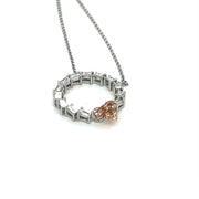 This Circle Diamond pendant with Diamond Ribbon features a stunning combination of baguette diamonds set in 18k white gold, accented with a beautiful rose gold ribbon adorned with round brilliant diamonds.