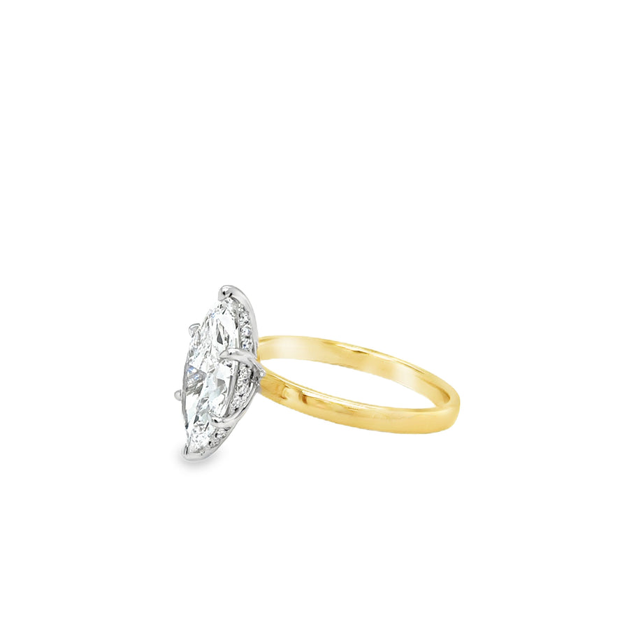 This expertly crafted Marquise Lab diamond Solitaire Ring features a top section set with an elegant hidden halo of round brilliant natural diamonds, all nestled in a 18k white gold band. The contrasting 18k yellow gold shank adds to the allure of this breathtaking piece.