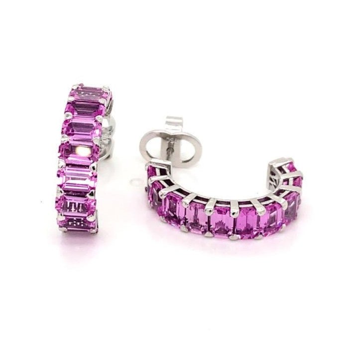 An exquisite pair of feminine Huggie Hoop Earrings featuring bright Pink Sapphires, which are superbly shaped into Emerald Cut and laced in 18ct White Gold.