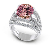 An 18ct white gold 4.3ct cushion cut pink tourmaline dress ring with 6 parallel diamond bands with a total diamond weight of 1.25ct F/SI1